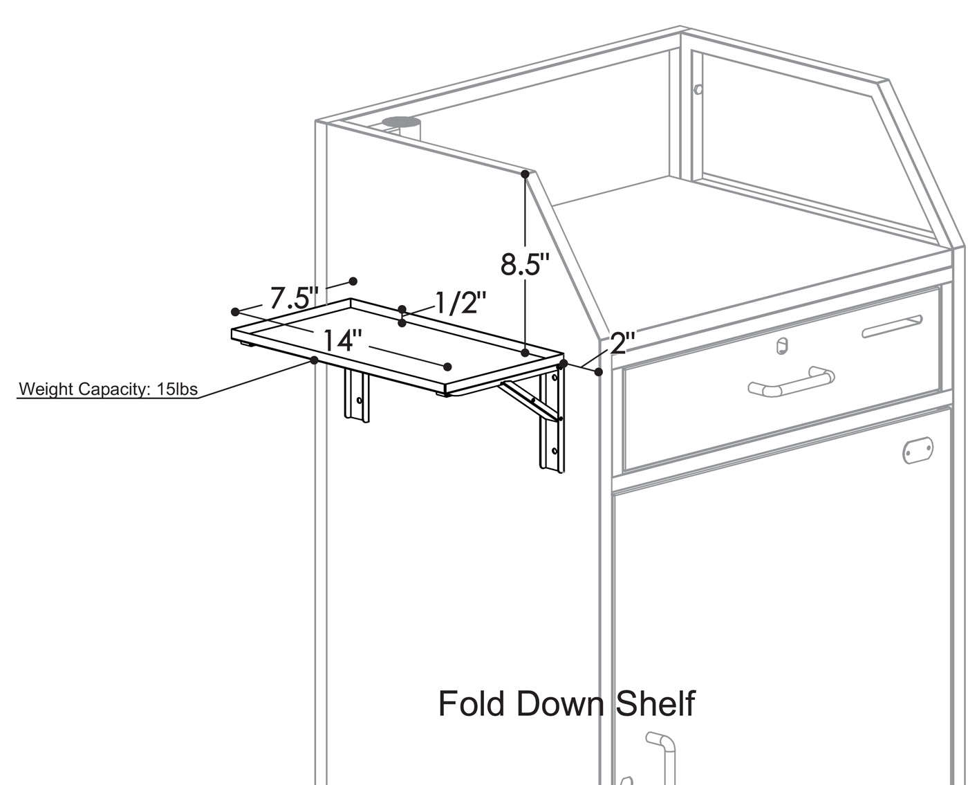 The Fold Down Shelf can also be retrofitted but will require the podium owner to drill it into the unit on location.