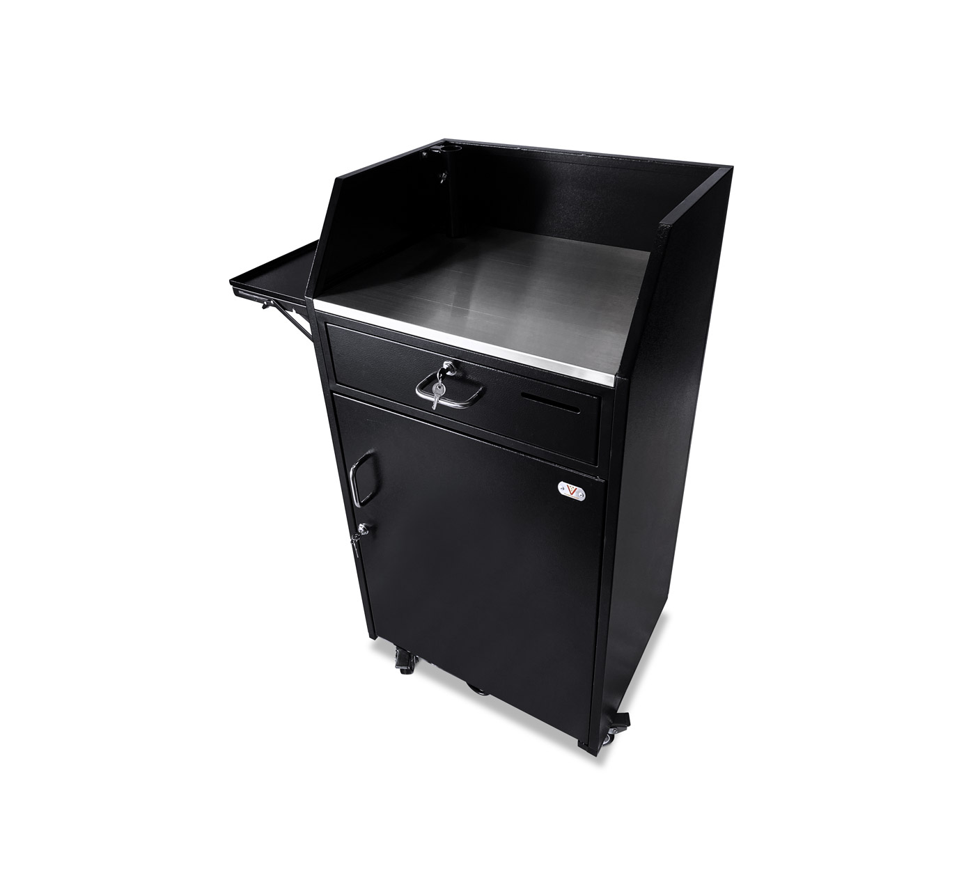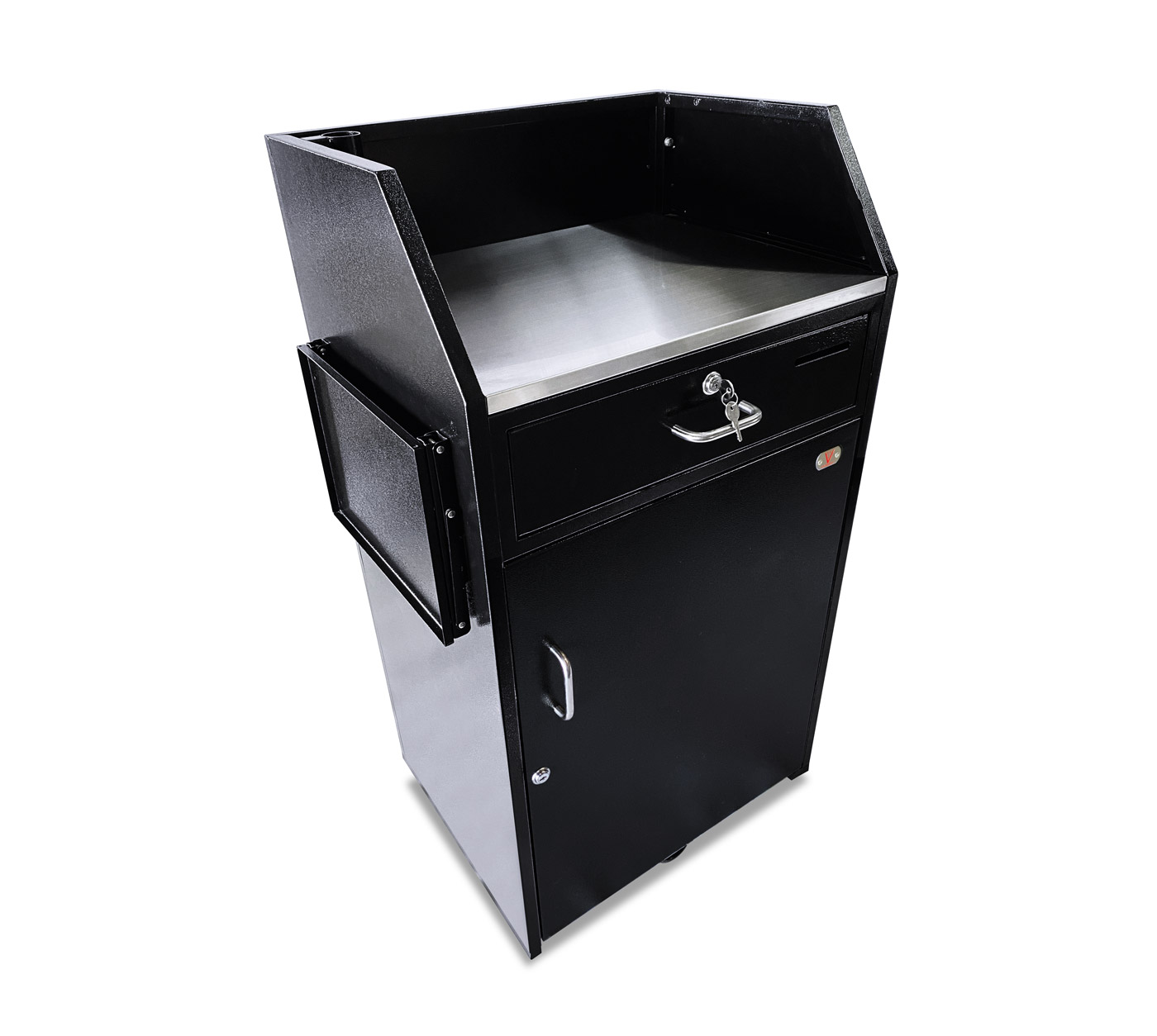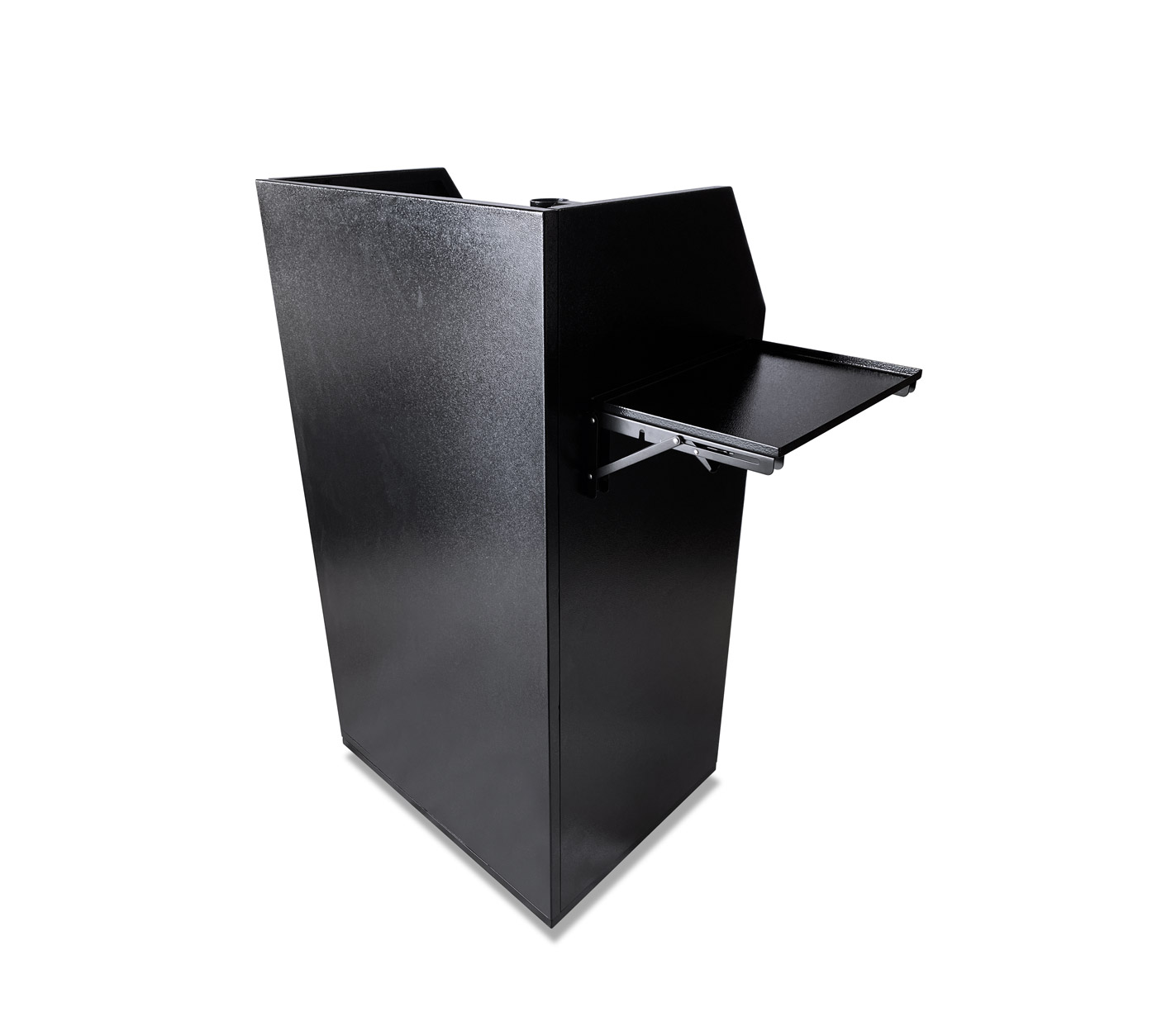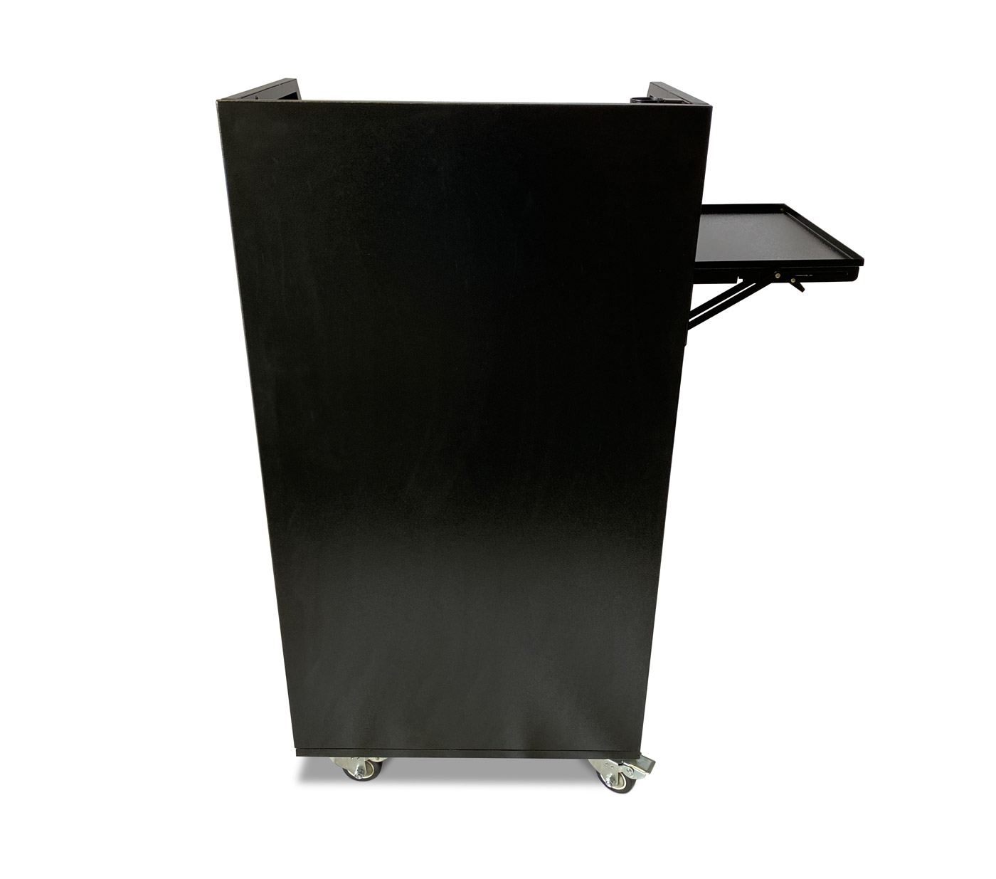 A Fold Down Shelf option for podiums that do not have a panel insert (Standard, Deluxe, Compact, Professional) that will be bolted to the podium on the left or the right side from the door/working side.