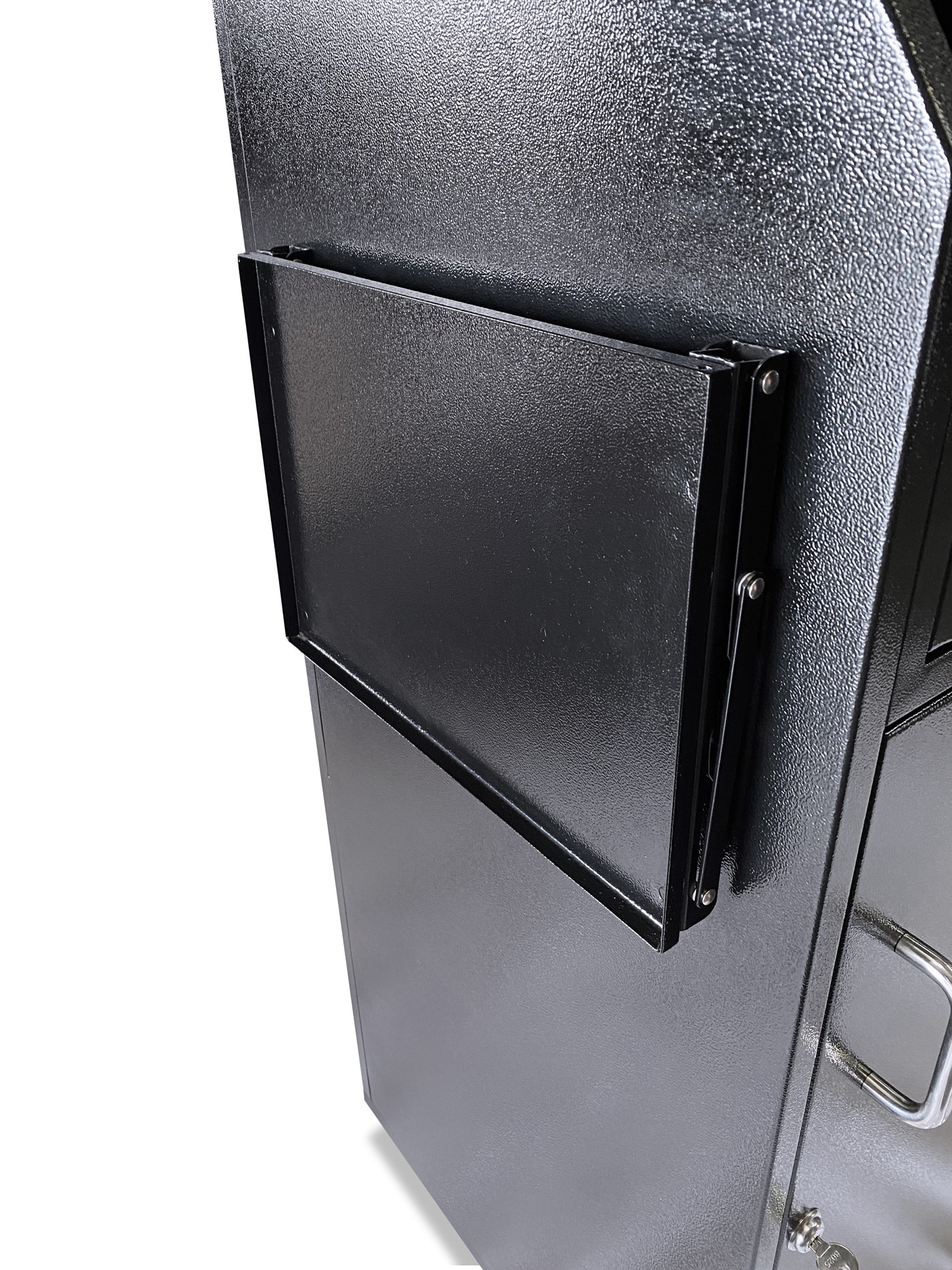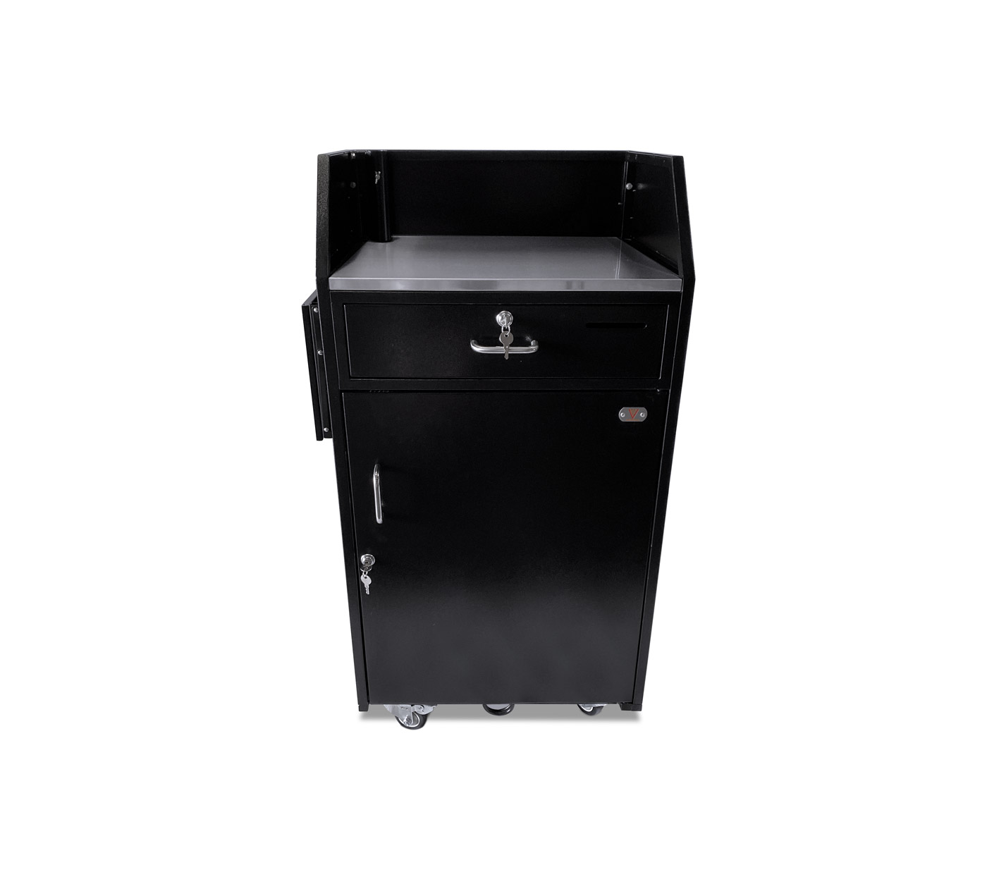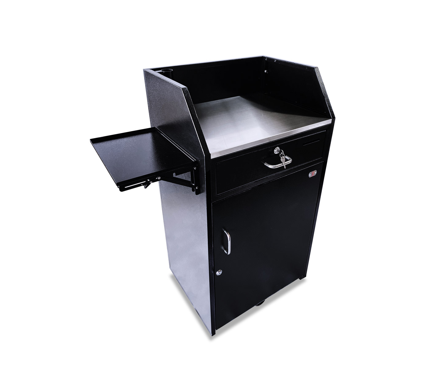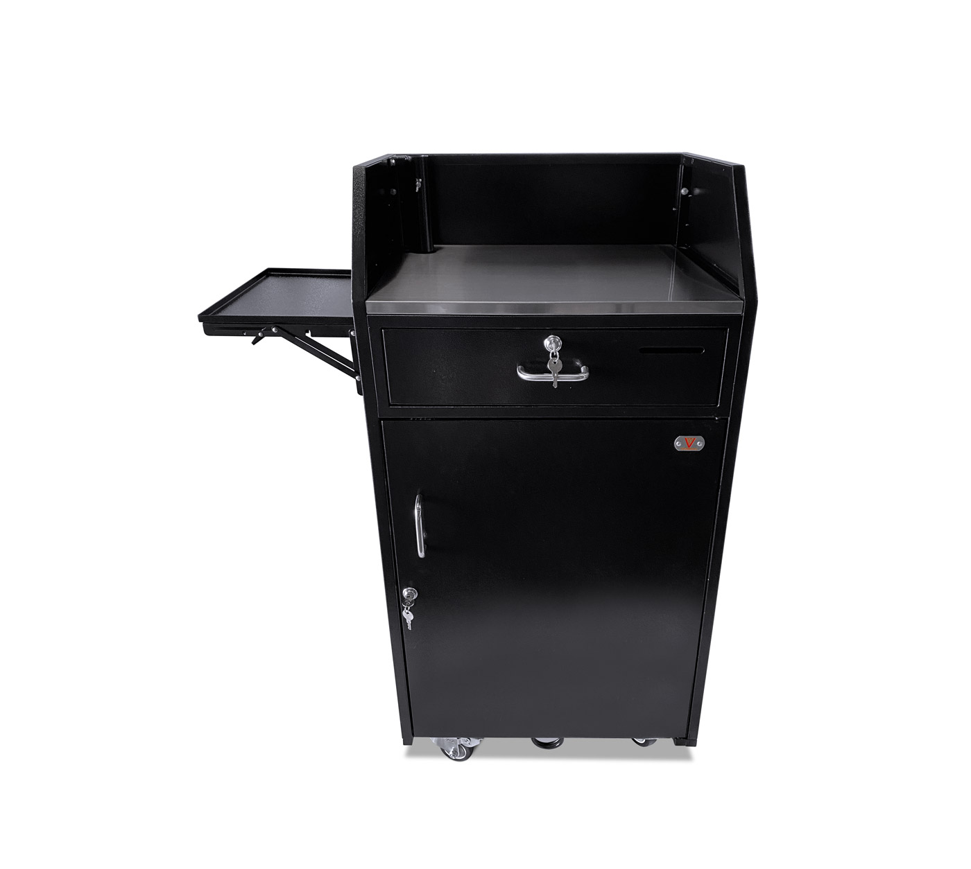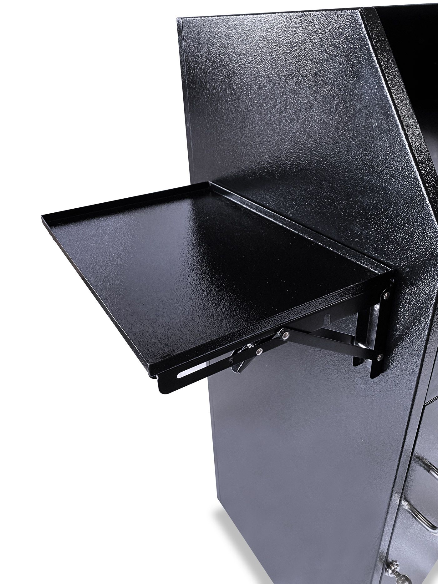A Fold Down Shelf option for podiums that do not have a panel insert (Standard, Deluxe, Compact, Professional) that will be bolted to the podium on the left or the right side from the door/working side.