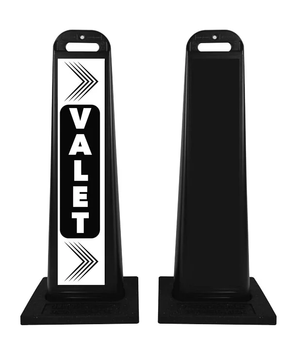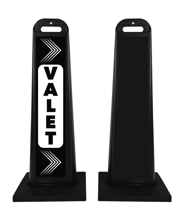 Our Delineator Signs are made of durable, black plastic with a 20 lbs. rubber base. The graphics are printed on to reflective vinyl for better visibility. For custom graphics and logos, please call us at 877-977-8733 for more information.