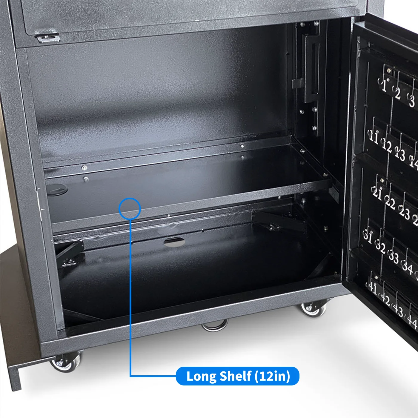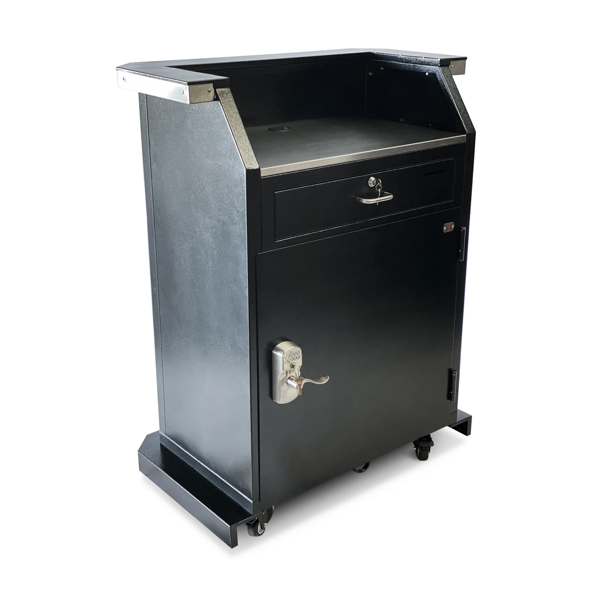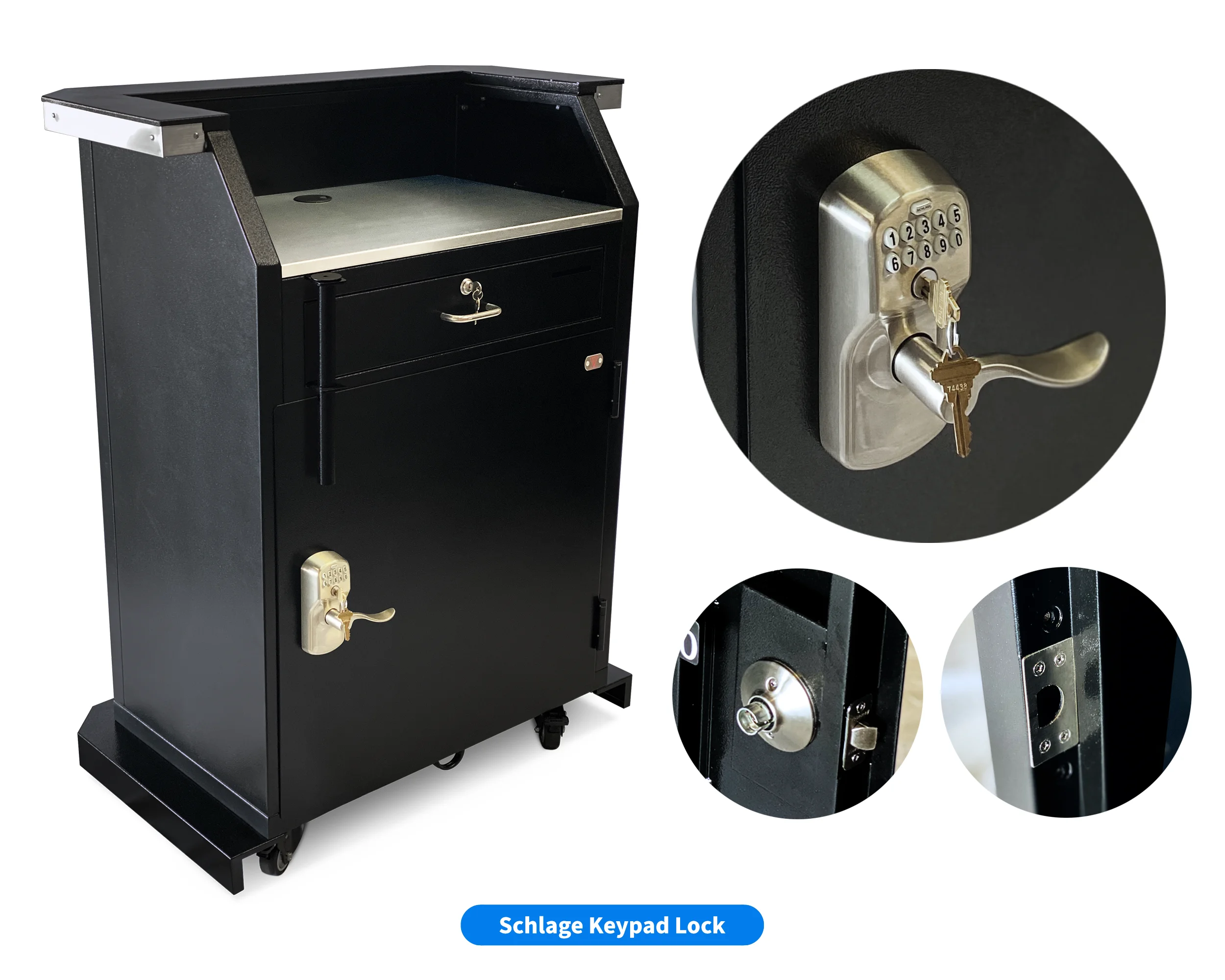 The Heavy Duty Deluxe Valet Podium comes with the SCHLAGE FE575 door lock which provides convenient, secure keyless access for up to 19 different users and locks automatically when the door is shut.