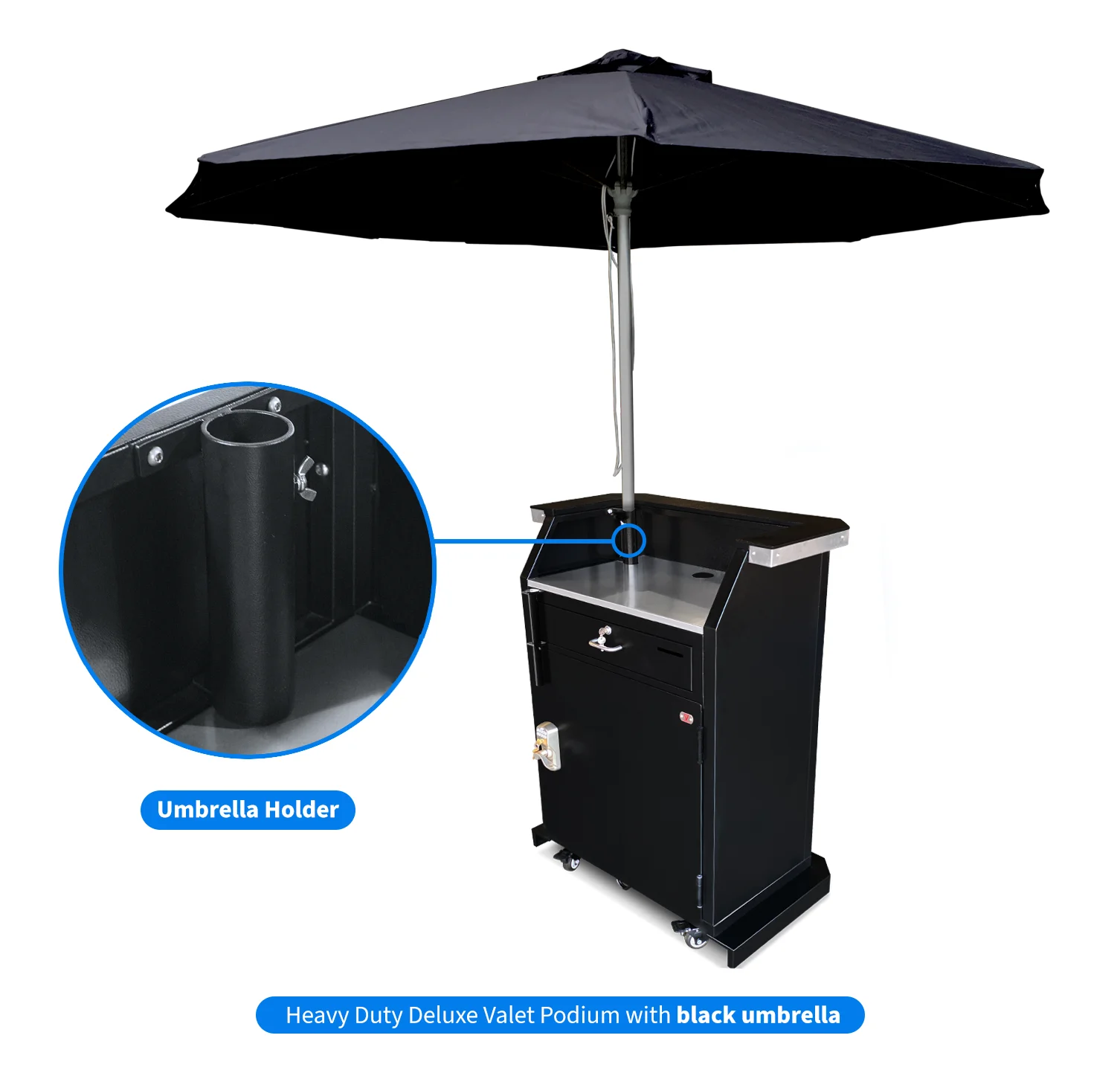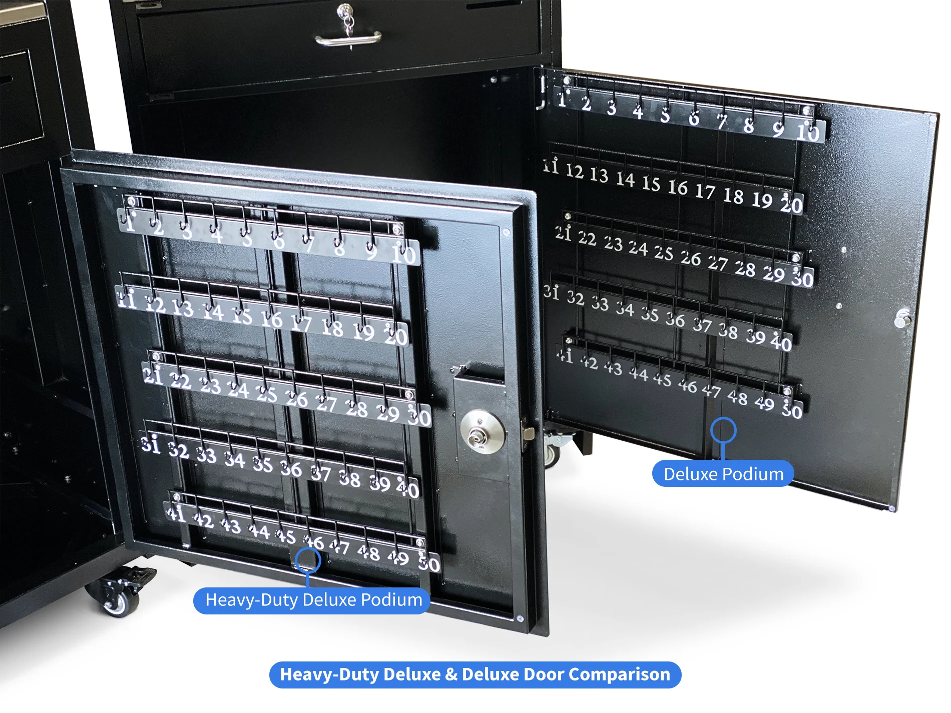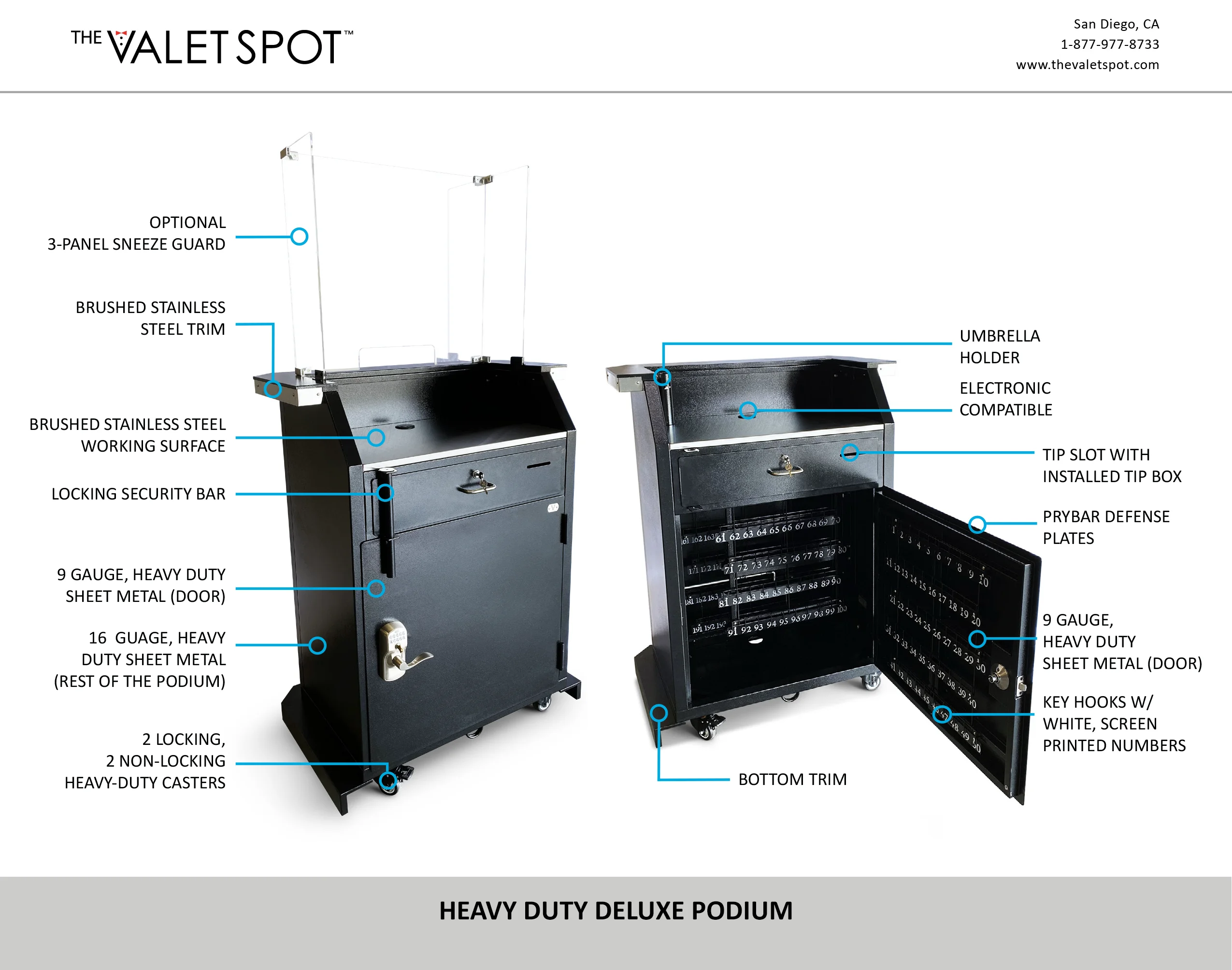 The Heavy Duty Deluxe Valet Podium is designed for operators who need their podiums to do more. This tougher version of our Deluxe Podium is fortified for maximum protection against damage and theft. The heavy-duty frame has a more rugged tubular design and is heavier and wider. This podium also has advanced key security features. The strong hinges, locking security bar, and prybar defense plates deter and defend against break-ins.