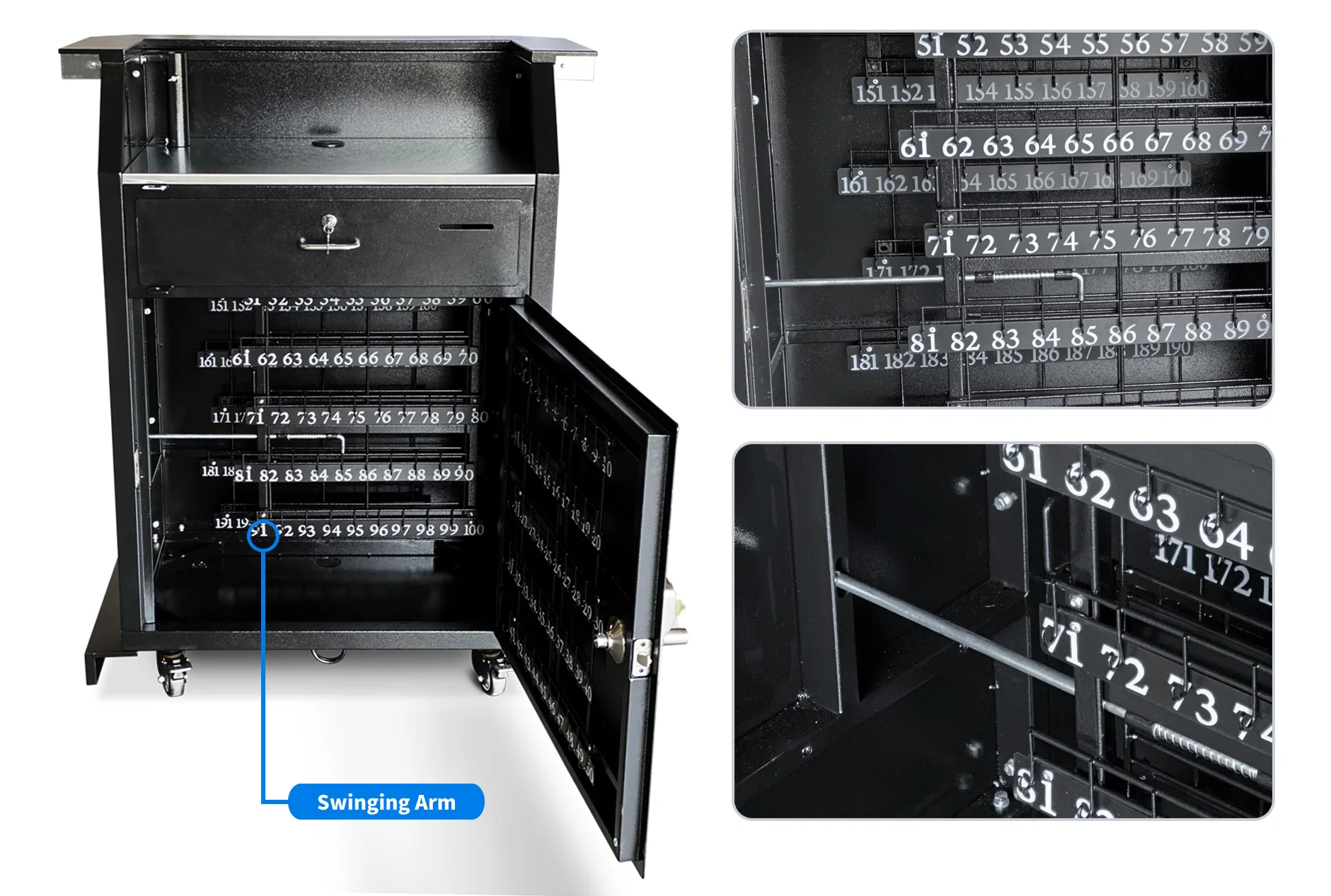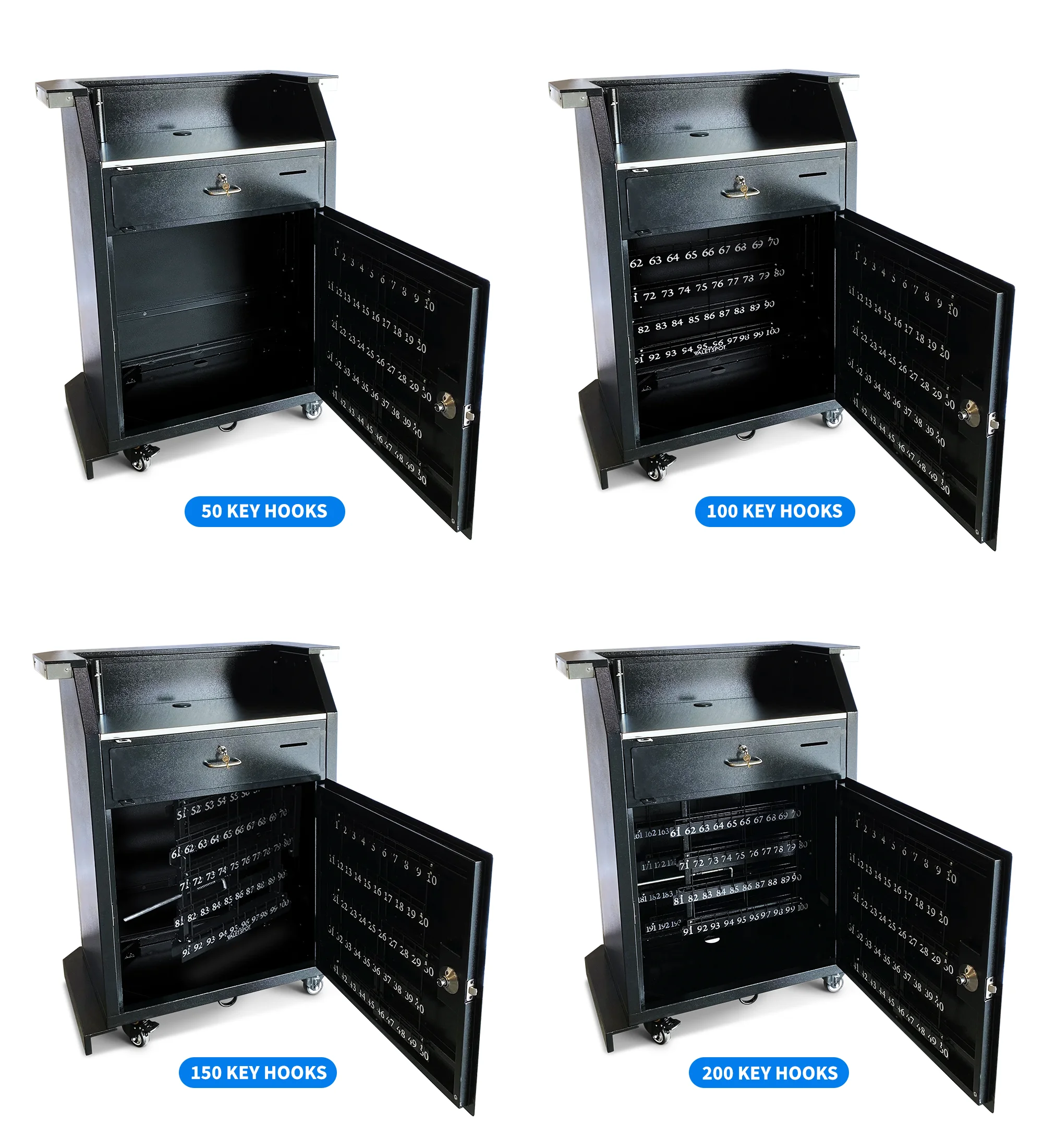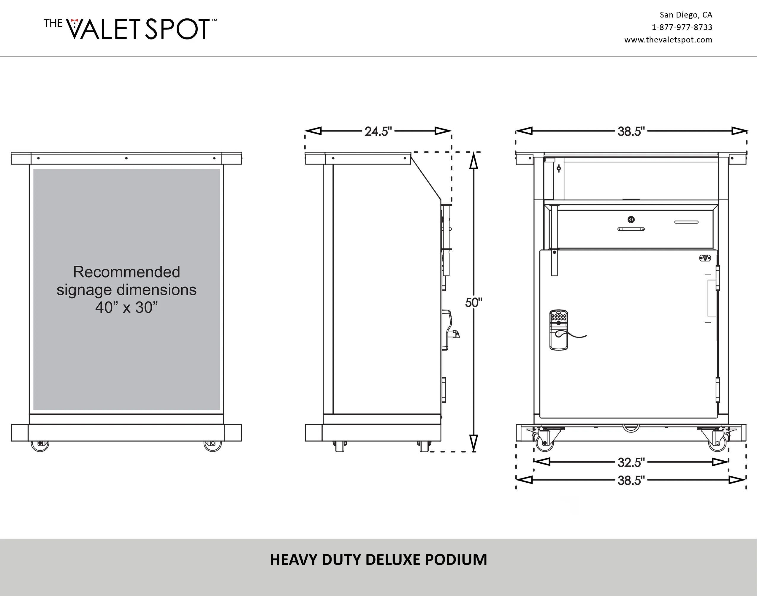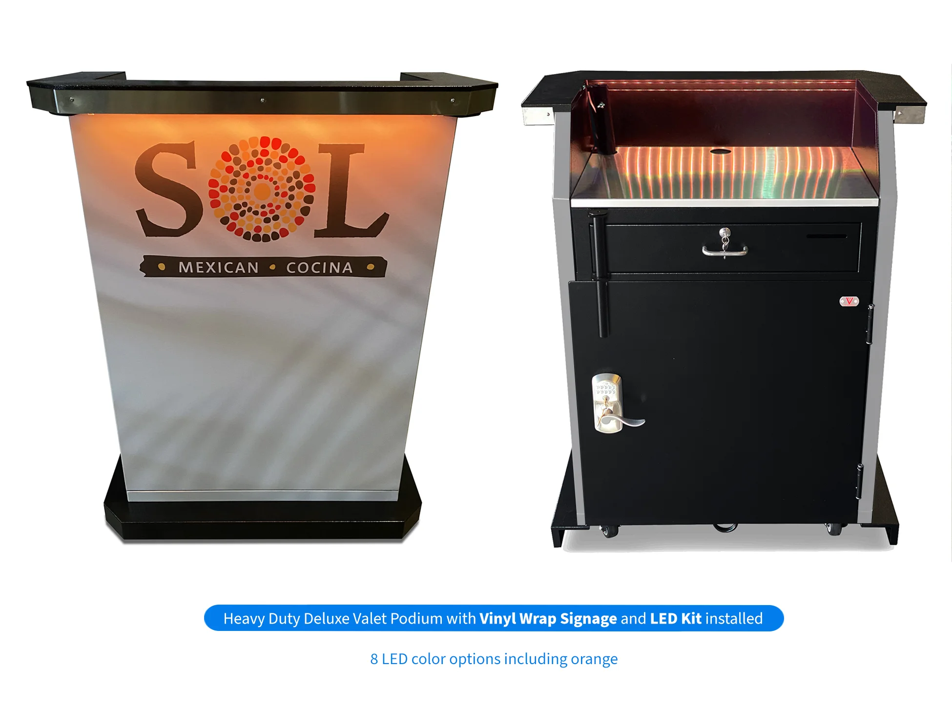 The Heavy Duty Deluxe Valet Podium is designed for operators who need their podiums to do more. This tougher version of our Deluxe Podium is fortified for maximum protection against damage and theft. The heavy-duty frame has a more rugged tubular design and is heavier and wider. This podium also has advanced key security features. The strong hinges, locking security bar, and prybar defense plates deter and defend against break-ins.