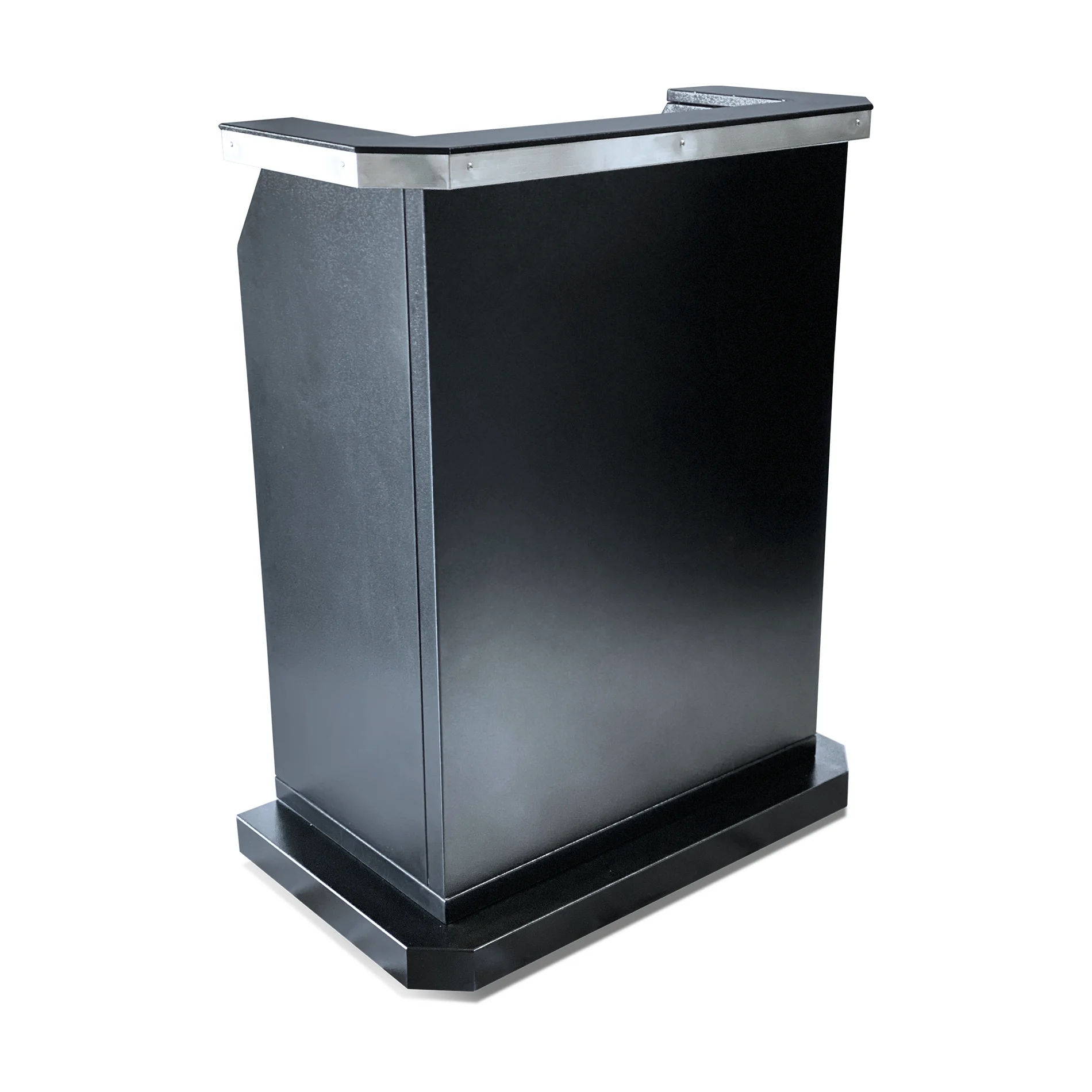 Steel trim at the base of the podium provides a tough, professional look and hides the heavy-duty locking casters.