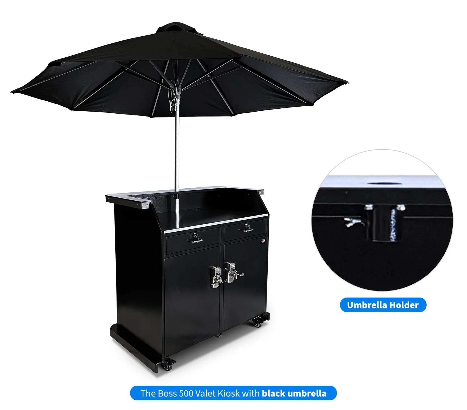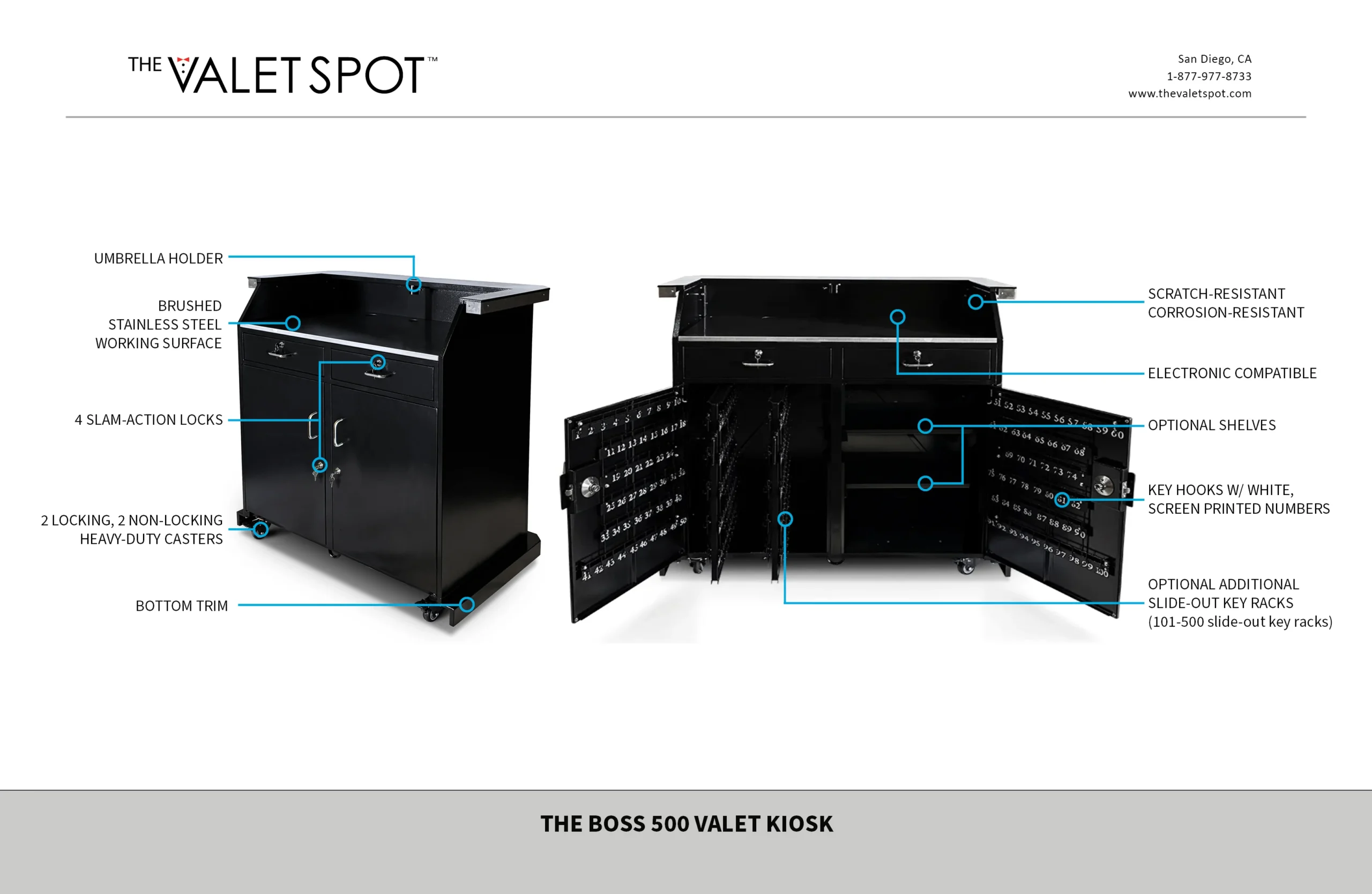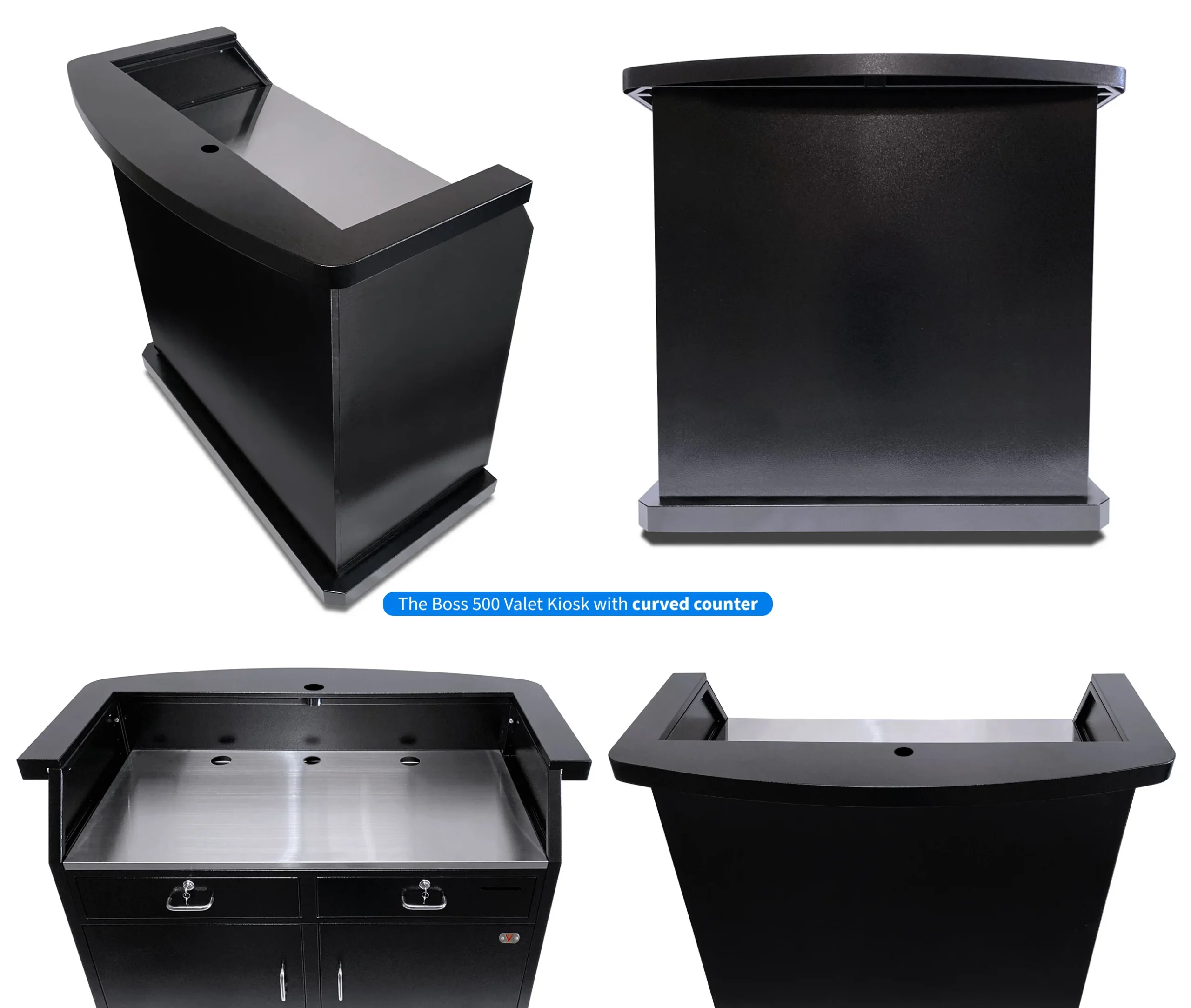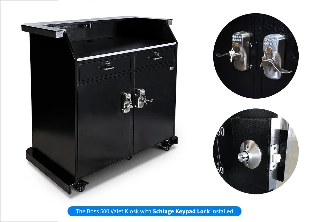 Meet the Boss Valet Kiosk: A high volume industry titan capable of securely managing up to 500 keys thanks to chic and intuitive slide-out key racks. Unmatched Capacity is just the start. The Boss – inspired by our iconic Professional Kiosk – offers essential standard features, including durable stainless steel construction, high-visibility key hooks with white screen printed numbers, and an attractive brushed stainless steel working surface. Plus, the Boss Valet Kiosk embodies the industry-leading excellence of The Valet Spot with popular upgrades like Schlage keypad locks, trim color, a curved counter, an LED kit, and more.