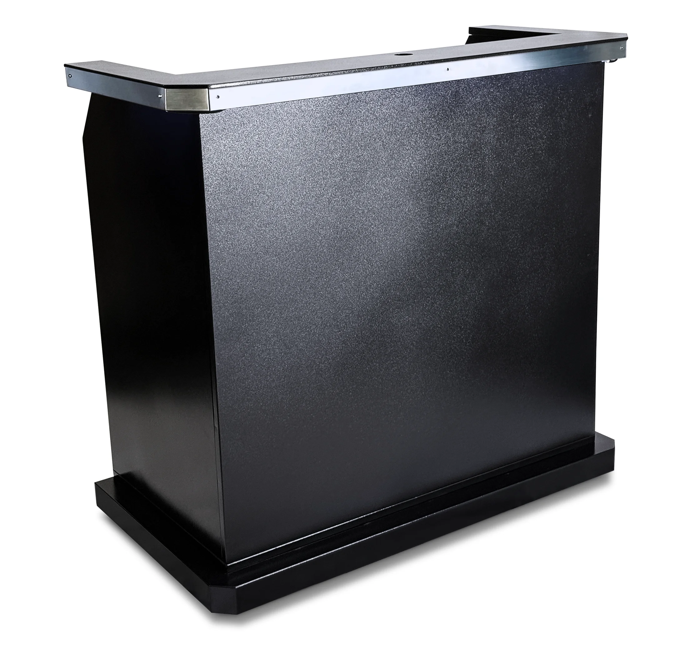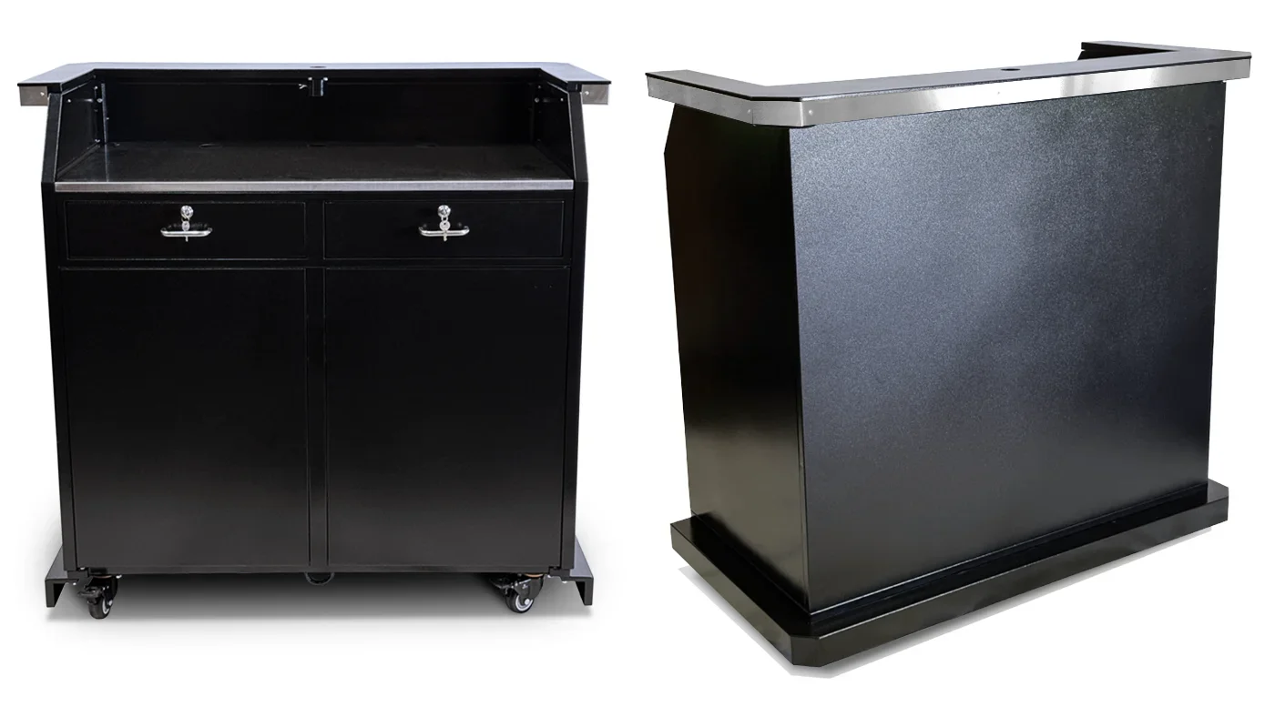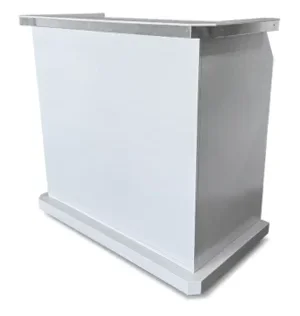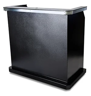 The optional LED kit upgrade makes the panels glow. The LED kit is powered by a rechargeable cordless battery system with an 8-hour charge cycle. If you need to light up the podium for longer than 8 hours, it can be plugged directly into an electrical outlet. The LED kit also comes with a remote operated controller which has multiple speed, brightness, and color settings.