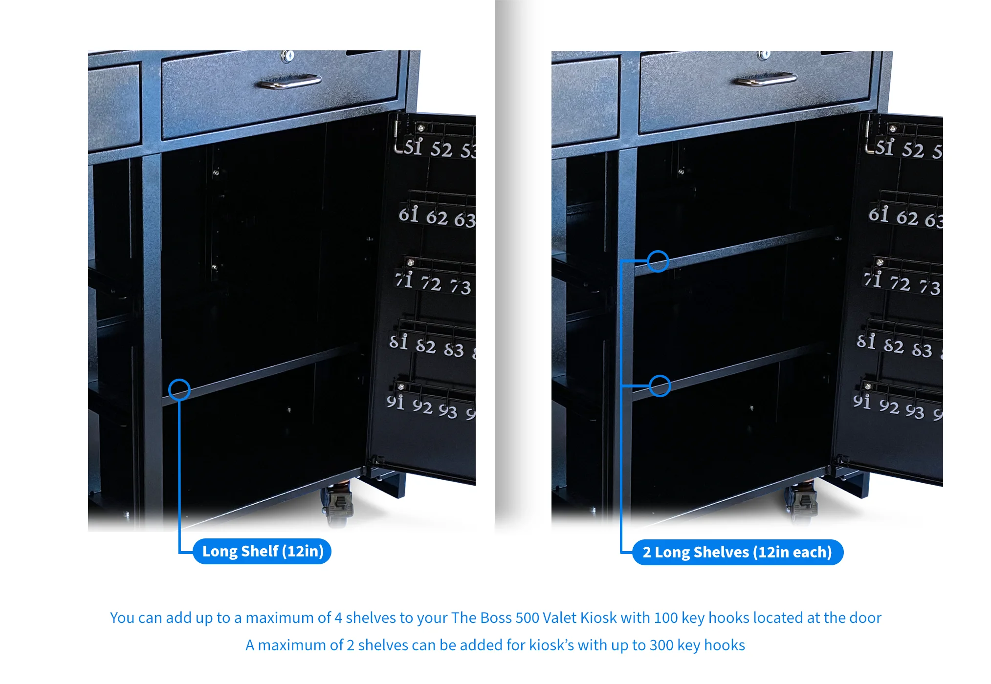 Tailor the Boss for your business needs. Design your ideal setup, choosing from a range of configurations from 100 key hooks and 4 shelves, to a maximum capacity of 500 key hooks with no shelves.